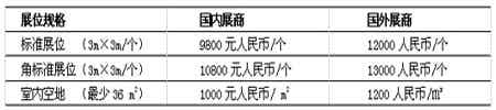 注:a. 标准展位提供:三面围板、楣板制作、洽谈桌一张、折椅两把、射灯两只、10A插座一个。