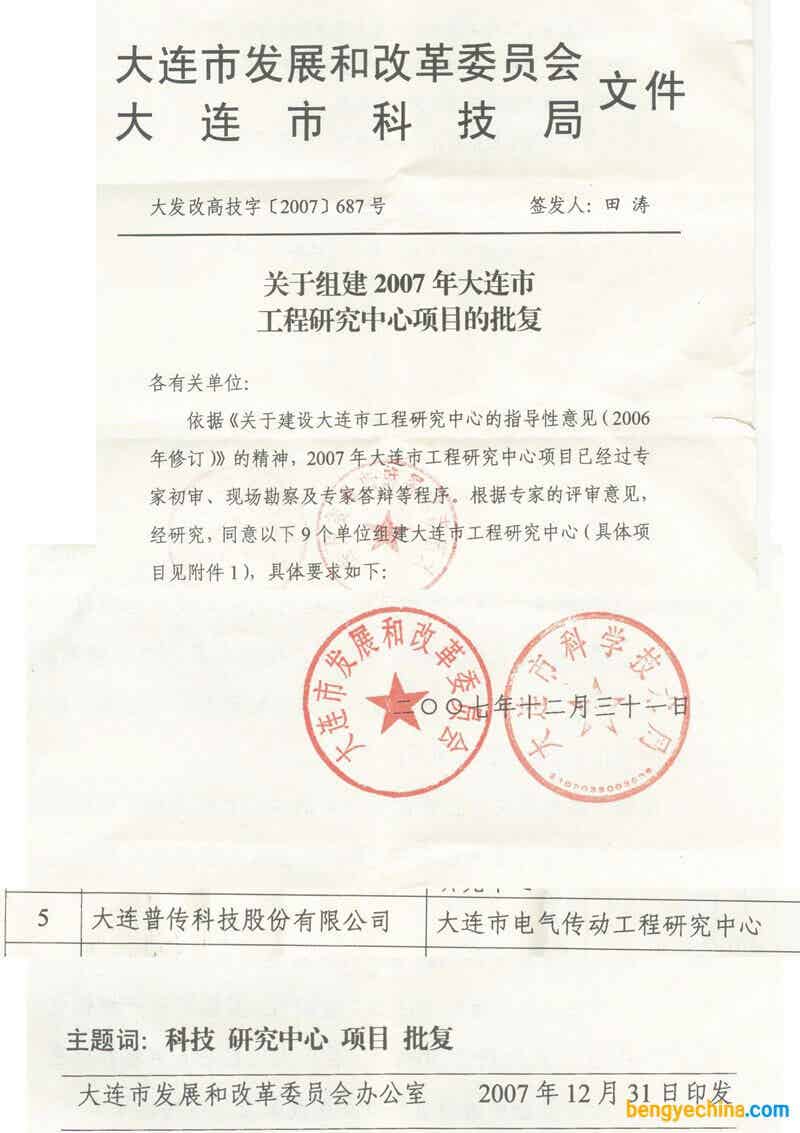 2007年12月31日,大连市发改委、大连市科技局公布了2007年大连市工程研究中心认定名单(大发改高技字〔2007〕687号),大连普传科技股份有限公司荣列其中。