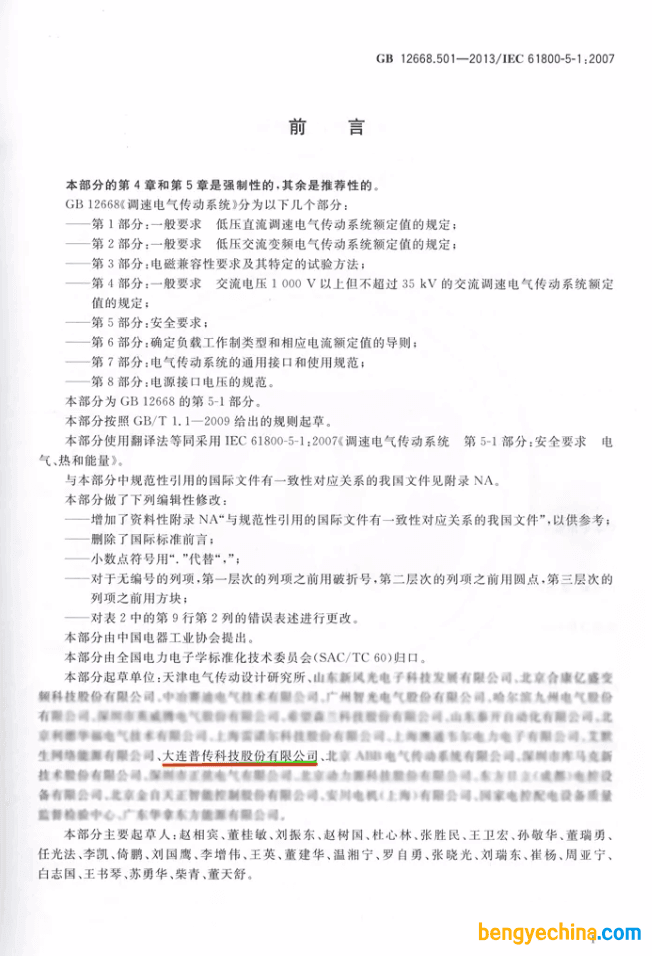 2014年8月7日,大连普传科技股份有限公司参加起草的《调速电气传动系统》系列第五部分“安全”强制性两个标准正式开始实施。