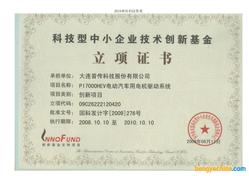 2009年6月8日,科技部创新基金中心发出《科技型中小企业技术创新基金2009年度第一批立项项目公告》,公布了各地2008年底申报的创新基金创新项目的立项结果。本批立项项目共计2725项,资助总金额为16亿6696万元。本批立项项目总数、总体资金规模相当于去年全年规模。大连市科技局积极组织指导企业申报。第一批获36项支持,在计划单列市名列前茅,资金2005万元。公司承担的“PI7000HEV电动汽车用电机驱动系统”项目申报成功(立项代码09C26222120420),获无偿资金支持。
