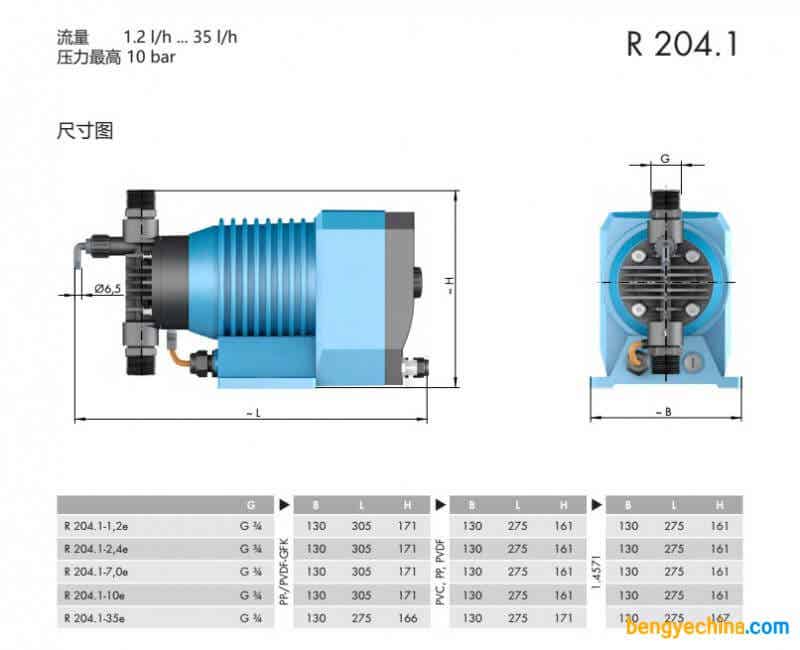 电磁隔膜泵204.1系列由电源控制,多功能加药泵在工业设计中可实现运行时的可靠性。流量范围从0.4l/h至 35l/h,背压可达10bar。