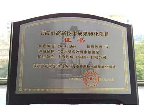 工业泵网近日,上海连成泵业集团开发研制的QZ大型高效潜水轴流泵在经上海市高新技术成果转化项目认定办公室严格审定后,正式被认定为上海市高新技术成果转化项目。有效期至2019年12月。(项目编号:201411569 ,项目等级:B。)