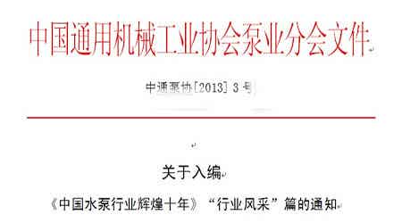 关于入编《中国水泵行业辉煌十年》“行业风采”篇的通知