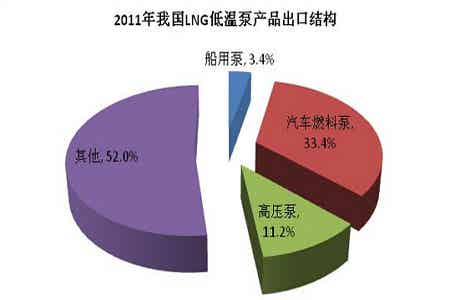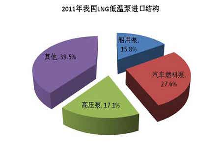 LNG低温泵是一种专门用于输送低温液体的无轴封电动泵既有单级泵,也有多级泵。我国LNG低温泵产品进口主要集中于汽车用泵、船用泵以及工厂用高压泵,2011年我国LNG低温泵以上三类进口比例分别为15.8%、27.6%和17.1%。