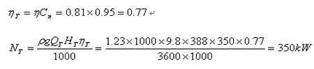 4)按上述已知泵的流量、扬程(单级)和转速,即可选取一台最佳效率的泵。在本例中,选用的泵是两级,叶轮直径315mm,效率为81%。此泵用作水力透平时产生的轴功率NT计算如下: