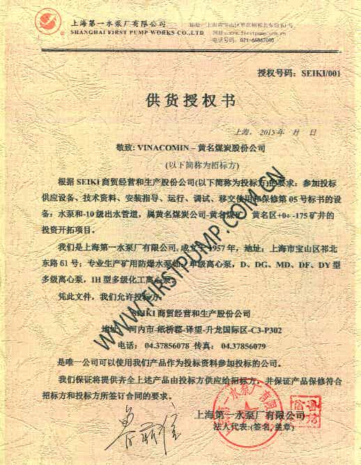 SEIKI商贸经营和生产股份公司参加投标供应设备、技术资料、安装指导、运行、调试、移交使用和保修第05号标书的设备:水泵和-10级出水管道,属黄名煤炭公司-黄名煤矿,黄名区+0¸ -175矿井的投资开拓项目。是唯一公司可以使用我们产品作为投标资料参加投标的公司。
