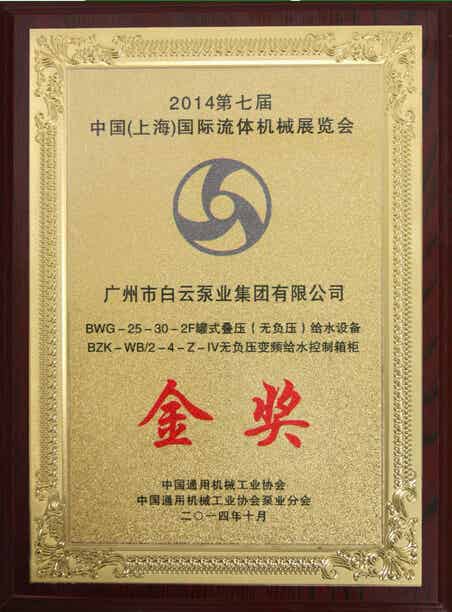 2014年10月,由中国通用机械工业协会主办的 “2014第七届中国(上海)国际流体机械展览会”在上海世博展览馆隆重开幕,广州白云泵业集团携最新产品组团参加了此次盛会。在精英汇集、精品荟萃的众多产品中,集团的BWG罐式叠压(无负压)给水设备及BZK-WB无负压变频给水控制柜荣获“金奖”。 白云品牌以其专业化的产品得到了业界的普遍好评。