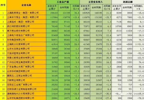 2015年上半年国内主要泵企收入排行榜于近日正式出炉。根据数据显示,各大企业之间盈亏不一,以排在前十名的企业为例进行数据分析,可以发现工业总产值方面10家企业当中有7家企业与去年同期相比呈增长态势,3家企业与去年同期相比出现负增长;主营业务收入方面,10家企业中有7家企业与去年同期相比出现增长的态势,3家企业出现负增长;利润总额方面,10家企业与去年同期相比出现增长和负增长状况的各一半。综合这10家企业的情况分析,可以看出国内泵业企业生产状况保持着良好的态势。