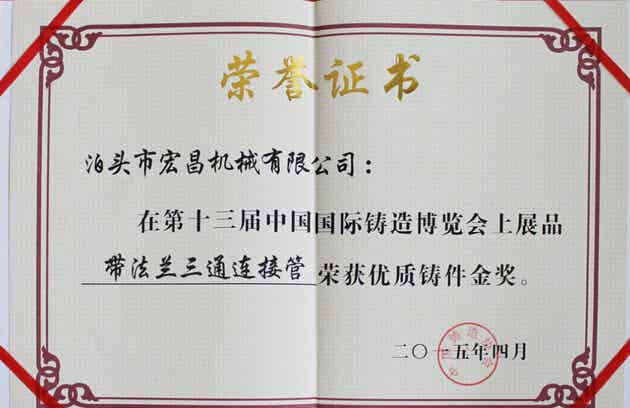 第十三届中国国际铸造博览会于2015年3月31日在上海国家会展中心隆重召开,河北安吉宏业集团公司下属子公司泊头市宏昌机械有限责任公司参展铸件“带法兰三通连接管”以其复杂的工艺结构,光洁的铸件外观一举荣获优质铸件金奖。