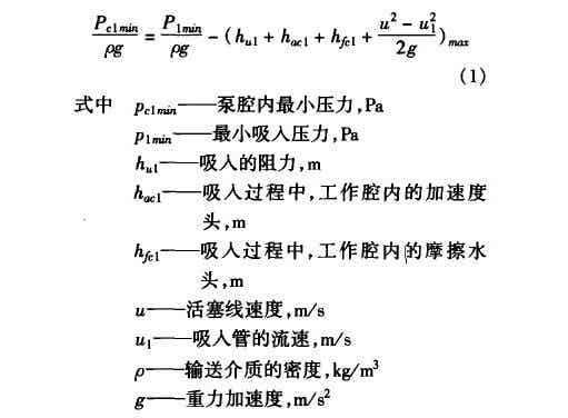 式中Pv—液体在工作温度下的饱和蒸汽压力,Pa否则将会引起工作腔内液体汽化,造成柱塞(活塞)与液体脱流,从而引起工作腔内的撞击、噪声、振动、流量减少、断流甚至破坏机械零件酿成不良后果。