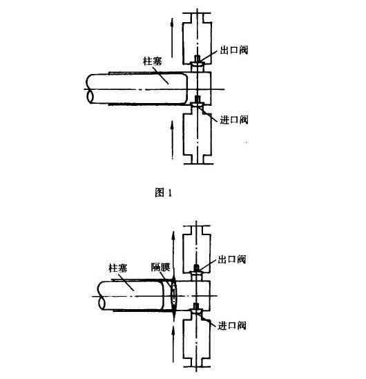 2.3 低压进口对不同型式的泵的影响往复式计量泵按液力端的不同可分为柱塞式(活塞式)(见图1)和隔膜式(见图2)(动力端相同)。柱塞式(活塞式)液力端借助柱塞及密封元件形成工作腔,通过柱塞的周期性的往复运动,使工作腔内的压力的大小交替变化,从而实现吸人和排出的功能。隔膜式液力端借助于隔膜(膜片、波纹管等)形成工作腔,通过隔膜的周期性变形代替柱塞的周期性的往复运动,使工作腔内的压力的大小交替变化,从而实现吸人和排出的功能。