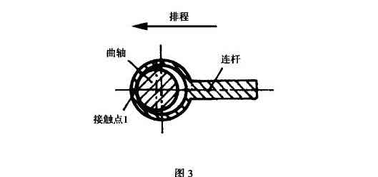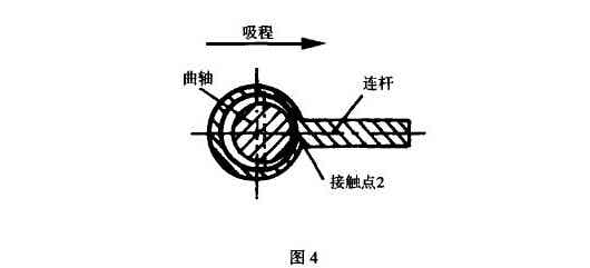 3.2 高压进口对泵使用寿命的影响当泵的人口压力过高时,还会影响泵强度进而使动力端部件(曲轴、轴瓦)使用寿命缩短。正常情况下,泵在吸程时,在主驱动力的作用下,曲轴拉着连杆作往复运动,连杆与曲轴的接点1(如图3)在连杆的前端、曲轴的前端;泵在排程时,在主驱动力的作用下,曲轴压着连杆作往复运动,连杆与曲轴的接点2(如图4)在连杆的前后端、曲轴的前后端接触点周期交替。如果泵进口压力过高,在吸程时,由于进口压力高,连杆与曲轴作用于接触点2,排程时两者也作用于接触点2,连杆始终受力于前端、曲轴也始终受力于前端,恶化了连杆与曲轴的受力情况,而同时,由于接触点2始终没有润滑油润滑,也将会降低泵的使用寿命。