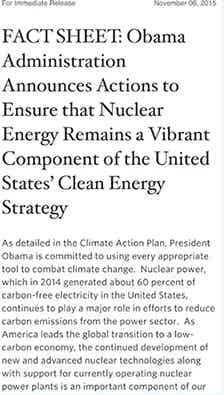 美国过去50年来一直在运行着世界上最庞大的核电机群,美国最近还有四个新的核电机组被核准兴建。就在三天前,奥巴马政府又刚刚发布了关于确保核能作为美国清洁能源重要组成部分的声明(见下图)
