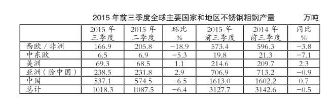 国际不锈钢论坛(ISSF)12月21日发布的最新统计数据显示,2015年前三季度全球不锈钢粗钢产量达到3127.7万吨,较上年同期的3142.6万吨下降0.5%,延续了上半年下滑的走势。从主要不锈钢生产国家和地区来看,除中国和美洲不锈钢产量继续保持增长外,全球其他主要地区均仍在下滑。