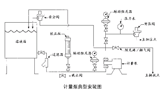 3.在计量泵出口管路中必须安装脉动缓冲器、安全阀。如压力低于3Bar时,建议加装背压阀,以免管路产生虹吸现象。