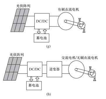 图1(e)所示拓扑结构通过DC/DC变换器驱动有刷直流电机,图1(f)通过DC/DC稳压后经逆变器驱动无刷直流电机,二者都适用小功率场合。图1(f)所示拓扑结构通过DC/DC变压后经逆变器驱动交流电机,此种结构在对于电压等级220 V、功率不超过1.5 kW和电压等级380 V、功率不超过2.2 kW的光伏水泵系统中具有更好的应用前景。图1(g)、图1(h)所示拓扑结构将蓄电池装置应用于光伏水泵系统,通过蓄电池来抑制光伏电池输出功率的短时间随机波动,以减少对水泵冲击,延长水泵使用寿命,提高光伏水泵系统效率。但是蓄电池的配置增加了投入成本,并非最佳的解决方案。蓄水池的方案更加方便、经济、易于维护、使用年限长等优点,被广泛应用。