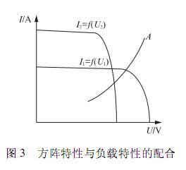 光伏阵列是光伏水泵系统的电源部分,输出电压和功率等级需要与电机相匹配。考虑安装地点的光照强度、光照时间、最佳倾斜角、环境温度和海拔等情况的不同,需改变光伏阵列串并联数,来优化阵列组合。光伏阵列与负载匹配度也是配置光伏阵列的重要因素。图3为光伏电池组件总数和环境条件相同的前提下,不同串并联组合下的光伏阵列形成的方阵特性,即I1= f(U1)、I2= f(U2)。其中曲线A为光伏水泵系统的负载特性曲线。由图3可知同一系统在不同方阵特性下的扬水性能大大不同,故需要选择与负载特性曲线匹配度高的光伏阵列,以提高系统效率,优化光伏阵列数。