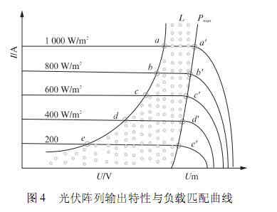 光伏阵列具有如图4所示的伏安特性,L为光伏水泵系统(光伏电池+控制器+直流电机+水泵)的负载特性曲线。负载特性曲线与不同光照强度时的光伏阵列特性曲线相交于a、b、c、d、e等点,为系统当前的工作点,并非光伏阵列可提供的最大功率点a'、b'、c'、d'、e',如图4中阴影线所示的面积是被浪费的阵列容量。为了匹配光伏阵列输出特性与负载曲线,光伏水泵系统MPPT技术被广泛应用,使得系统工作在pmax位置。