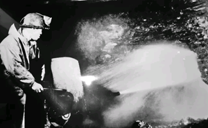 水采工作面的工人操作水枪采煤