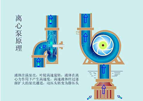 离心泵依靠旋转叶轮对液体的作用把原动机的机械能传递给液体。由于离心泵的作用液体从叶轮进口流向出口的过程中,其速度能和压力能都得到增加,被叶轮排出的液体经过压出室,大部分速度能转换成压力能,然后沿排出管路输送出去,这时,叶轮进口处因液体的排出而形成真空或低压,吸水池中的液体在液面压力(大气压)的作用下,被压入叶轮的进口,于是,旋转着的叶轮就连续不断地吸入和排出液体。