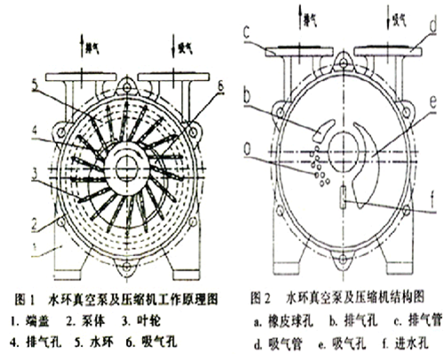 如图(1)所示,叶轮3偏心地安装在泵体2内,起动时向泵内注入一定高度的水作为工作液,当叶轮3按图示方向旋转时,水受离心力的作用在泵体内壁形成一旋转的封闭水环5,水环上部内表面与轮毂相切,水环的下部内表面刚好与叶片顶端接触。此时叶轮轮毂与水环之间形成一个月牙形空间,而这一空间又被叶轮分成与叶片数目相等的若干个小腔。如果以叶轮的上部0°为起点,那么叶轮在旋转前180°时小腔的容积由小变大,且与端盖上的吸气口相通,其空间内的气体压力降低,此时气体被吸入,当吸气终也时小腔则与吸气口隔绝;当叶轮在180°到360°的旋转过程中,水环内表面渐渐与轮毂靠近,小腔由大变小,其空间内气体压力升高,高于排气口压力时,当小腔与排气口相通时,气体被排出。叶轮每旋转一周,叶片间空间(小腔)吸、排气一次,若干小腔不停地工作,如此往复,泵就连续不断地抽吸或压送气体。