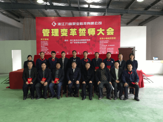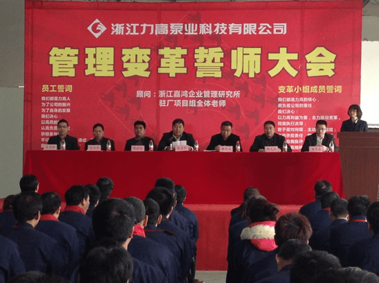 2015年3月10日下午3点,浙江力高泵业科技有限公司隆重召开了公司管理变革誓师大会,自此拉开了公司全面管理变革实施阶段的序幕。力高泵业公司总经理陈道秋先生、嘉鸿企业管理研究所董事长梅智成教授及各位老师、公司各部门领导全程参与大会。