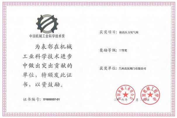 兰州高压阀门极高压力氧气阀荣获中国机械工业科学技术奖