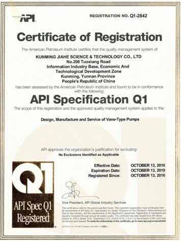 本次认证范围涉及叶片泵的设计、制造与服务。证书的取得,标志着嘉和科技股份有限公司的质量管理体系得到了API(美国石油学会)的认可,同时意味着嘉和科技正式取得了进入石油石化领域的“通行证”。