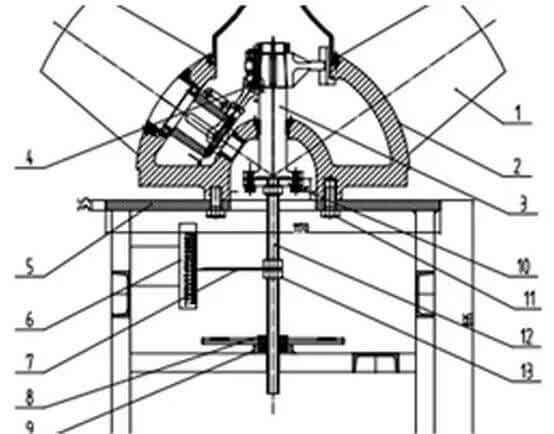 试验工作台由(5)35厚钢板和槽钢焊接而成、(6)标尺 、(7)指针 、(8)螺母转盘 、(9)分半卡座 、(10)连接法兰 、(11)连接螺钉、(12)M36全丝螺杆 、(13)M36螺母,而叶轮部件由(1)叶片 、 (2)叶轮座 、(3)下拉杆 、(4 )拐臂机构、等组成。当需要转动叶片角度时,拉杆上下运动通过球接头机构传到叶片枢轴,使叶片转动,可根据工况要求,调整叶片运行角度。