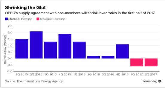 北京时间13日彭博报道,据国际能源署(IEA),随着石油输出国组织(OPEC)和其他产油国实施减产协议,全球石油市场将在明年上半年从供应过剩陷入供应不足。