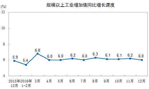 2016年12月份,规模以上工业增加值同比实际增长6.0%(下同,增加值增速均为扣除价格因素的实际增长率),较11月份回落0.2个百分点。从环比看,12月份,规模以上工业增加值比上月增长0.46%。2016年全年,规模以上工业增加值比上年增长6.0%。