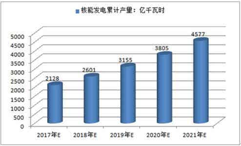 2015年1-10月,全国核能发电累计产量为1,404.56亿千瓦时,同比增长了30.99%;2016年1-8月,累计产量为1,364.00亿千瓦时,同比增长了23.7%。预计2017年核能发电量将达到2,128亿千瓦时,未来五年(2017-2021)年均复合增长率约为21.10%,2021年核能发电量将达到4,577亿千瓦时。