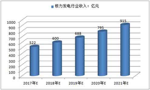 预计2017年我国核力发电行业收入将达到522亿元,未来五年(2017-2021)年均复合增长率约为15.05%,2021年收入将达到915亿元。