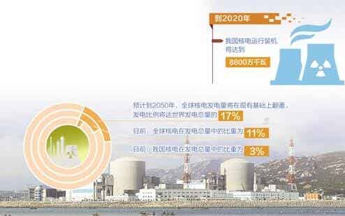 “到2020年,我国核电运行和在建装机将达到8800万千瓦。”国家原子能机构副主任、国防科工局副局长王毅韧表示,发展新能源是实现未来可持续发展的必然趋势,核电作为低碳能源,是新能源的重要组成部分,是我国未来能源可持续发展的重要基础。据经济合作与发展组织和国际能源署联合预测,到2050年,全球核电发电量将在现有基础上翻番,发电比例将达世界发电总量的17%。但目前我国核电在发电总量中的比重还较低,仅占3%左右,远低于全球11%的平均水平。因此,要在确保安全的前提下,高效发展核电。