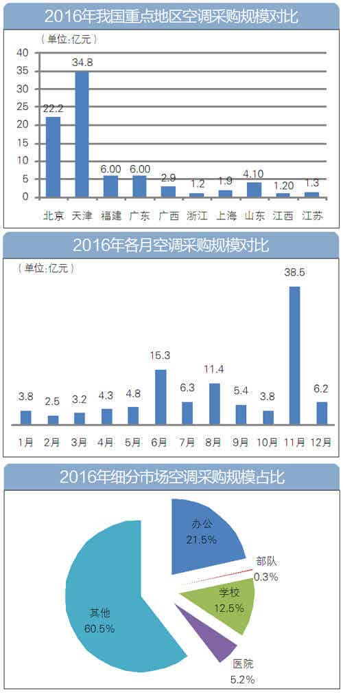1月,空调采购金额高达3.8亿元,其中2016年厦门大宗空调采购尤为抢眼;2月,虽然“量额”齐减,但千万级大标依然不少,一连出现3个;3月,多所高校开始启动空调线路改造项目招标;4月至5月,采购项目和采购规模实现环比齐增;而6月、8月和11月,依托多个重点民生项目,空调采购市场呈现出一派生机勃勃、欣欣向荣的繁荣景象,采购规模均在十亿元以上;7月、9月、10月和12月,空调采购规模企稳运行,恢复到以前的状态。