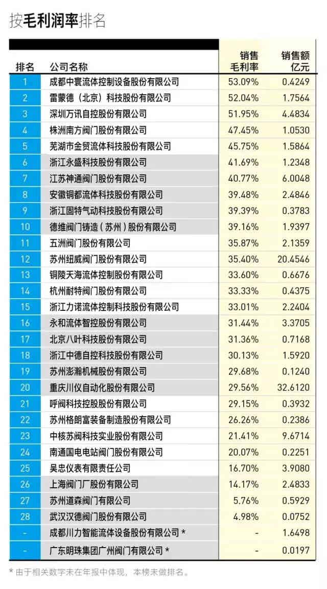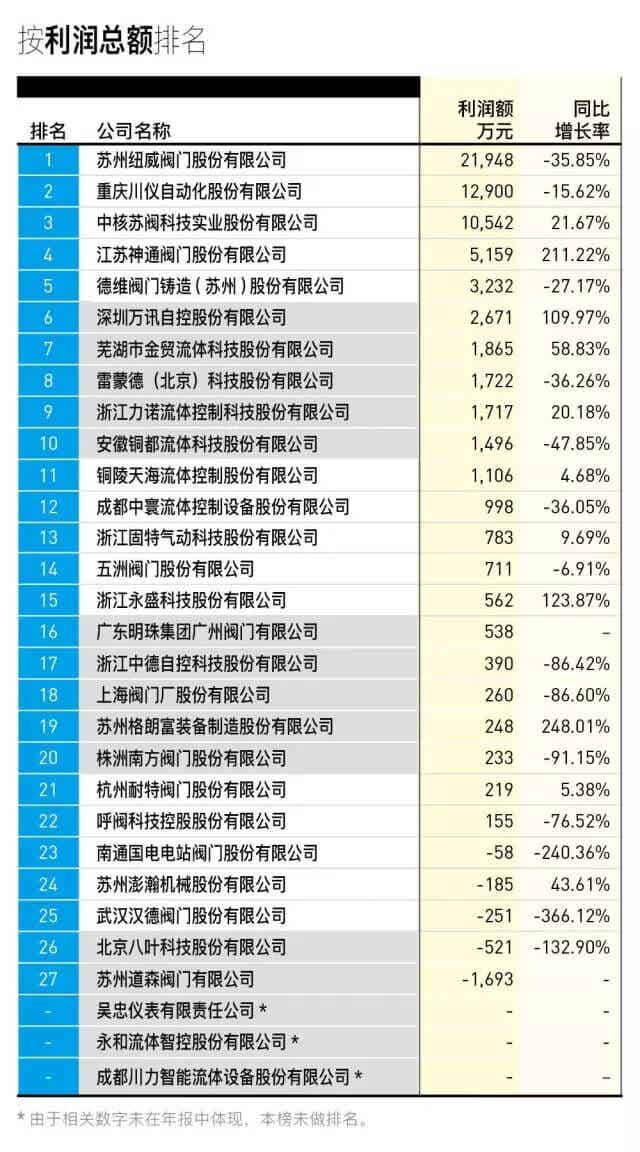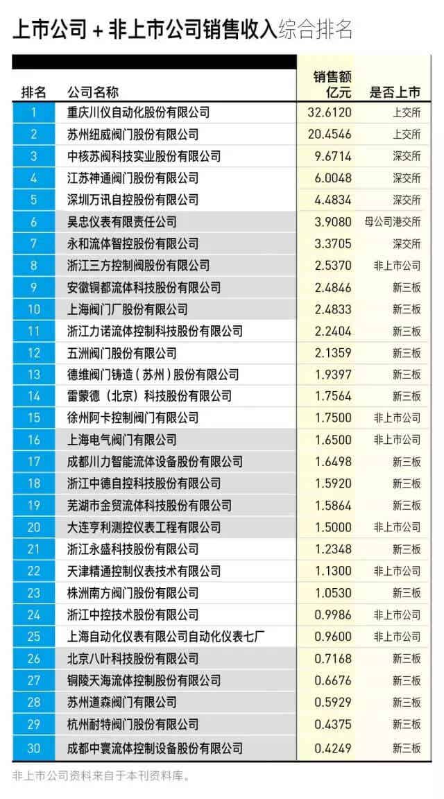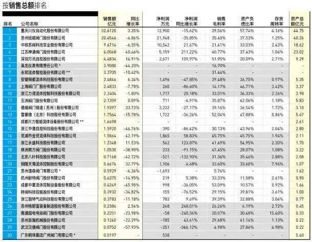 据了解,这30家阀门公司规模有大有小,产品种类各异,在一定程度上真实地反映了国内阀门企业的经营现状。此外,按照中国通用机械工业协会阀门分会的统计数据,2015年全国规模以上阀门企业(年销售收入2,000万元以上的企业)总计有1,806家,计算得出已经上市的30家阀门企业只占总数的1.66%。