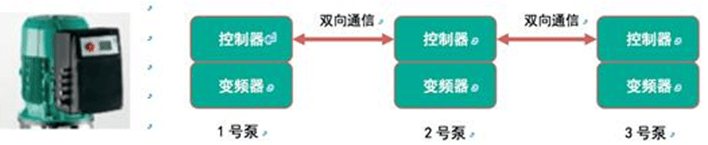 每台变频器内置主板控制器,且均具有独立的控制运行功能,泵与泵之间通过CAN总线互相联动运行。当一台泵控制器出现故障时其它泵可正常运行给用户供水。