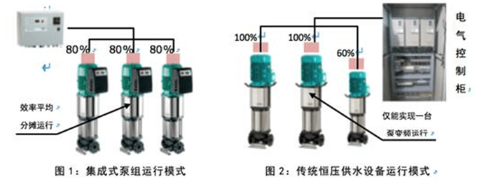 在同一工作泵组中,能够实现所有工作水泵同步变频运行,能够根据用水总需求量自动平均分摊运行效率(如图1),较传统恒压变频给水设备(如图2)节约电能13﹪以上。