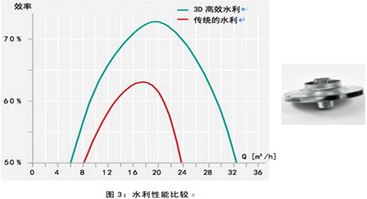 获得专利的3D叶轮设计使每级高压叶轮保持在同样高的效率水平。图3是用传统的水利部件和3D高效水利部件进行的性能比较,从图3中可知, 配置3D高效水利部件的泵效率提升高达10﹪以上。