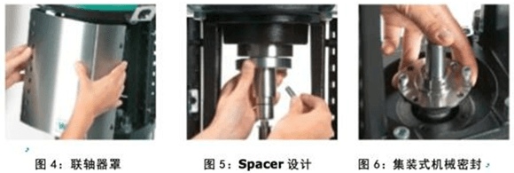 根据EN 2006/42/CE标准而设计的联轴器保护装置,如图4所示,独特的联轴器Spacer设计如图5,同时可配置集装式机械密封,如图6。所有以上设计保证了最短的维护时间。