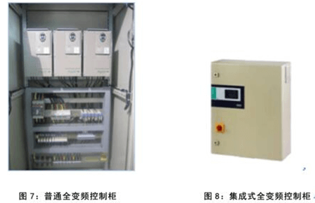 把变频器和控制器集成一体的水泵专用变频器,将不再需要体积庞大的控制柜(如图7、图8),减少了因控制系统中元器件及电气线路自身发热产生能耗约占水泵能耗3~5﹪左右。