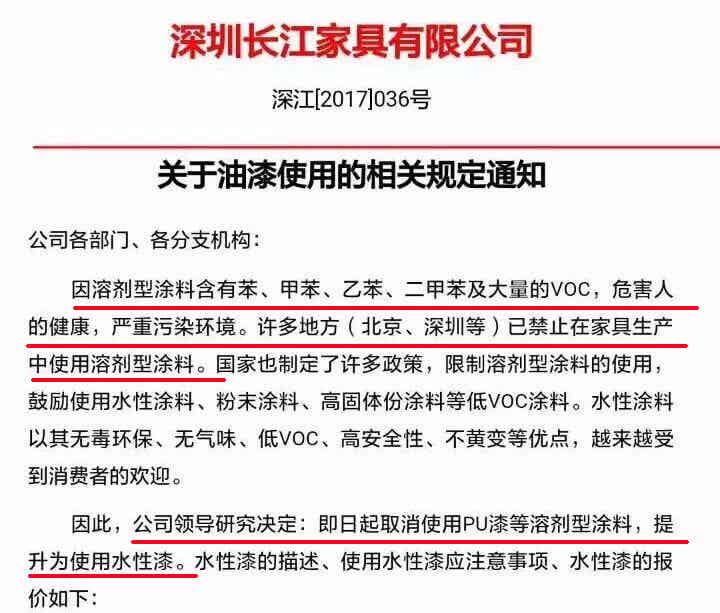 7月11日,深圳长江家具公司发布的“关于油漆使用的相关规定通知”引起了行业的关注。通知显示,因溶剂型涂料含有苯、甲苯、乙苯、二甲苯及大量的VOCs,危害人的健康,严重污染环境。因此,从2017年7月11日起,长江家具将取消使用PU漆等溶剂型涂料,提升为使用水性漆。