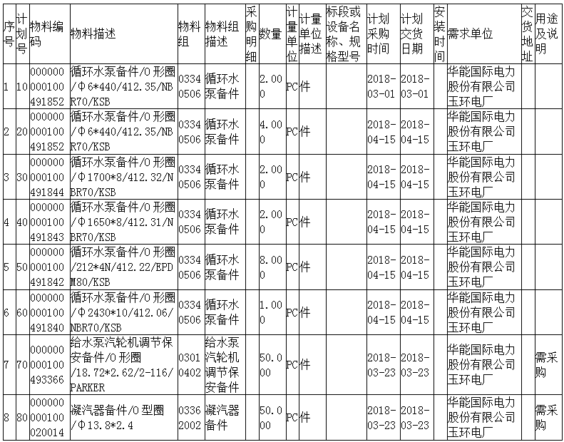 玉环电厂循环水泵等O型圈采购(S)询价公告