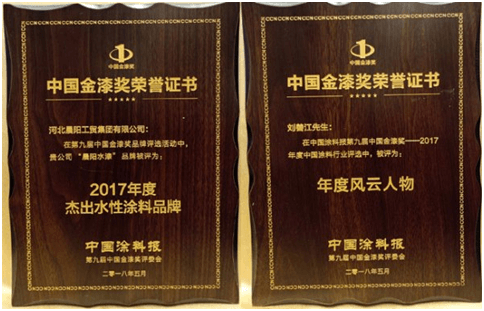 5月27日,在第九届金漆奖暨第九届中国涂料企业领袖峰会上,晨阳水漆凭借对水漆行业发展的突出贡献以及20年来对环保事业的坚守,荣获“杰出水性涂料品牌”、“杰出生态涂料品牌”、“杰出油改水战略合作伙伴”;晨阳水漆董事长刘善江荣获“2017年度风云人物”称号。