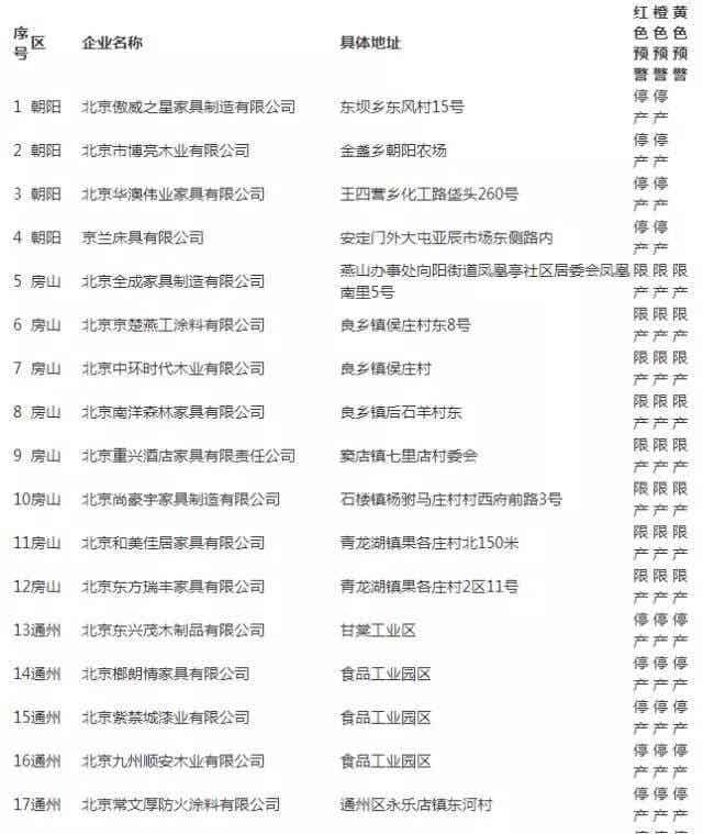 名单中,除北京京楚燕工涂料有限公司、北京常文厚防火涂料有限公司、北京永顺亮邦涂料厂等涂料生产企业外,涂料企业的下游产业也广受波及。家具企业限、停产数量达87家,记者调查了解到,作为传统的家具集散市场和生产基地,仅北京通州一地,在本次“限停潮”影响下,就有49家家具企业在名单内。