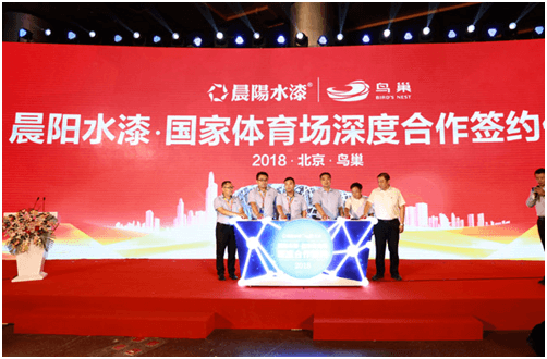 据知情人透露这已不是两者的第一次合作,早在2017年8月17日,在鸟巢金色大厅,鸟巢与晨阳水漆就签订战略合作协议。晨阳水漆成为鸟巢水漆指定供应商,鸟巢开始弃用油漆,改用绿色环保的晨阳水漆,将在2022年冬奥会前完成一次全面刷新,开启了“环保水漆第一刷”,树立起钢结构涂装“油改水”的典范。