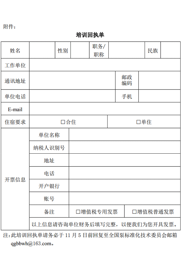 1、请参加培训人员于 11 月 5 日前将回执单(见附件),E-mail 至全国泵标准化技术委员会邮箱(qgbbwh@163.com)。