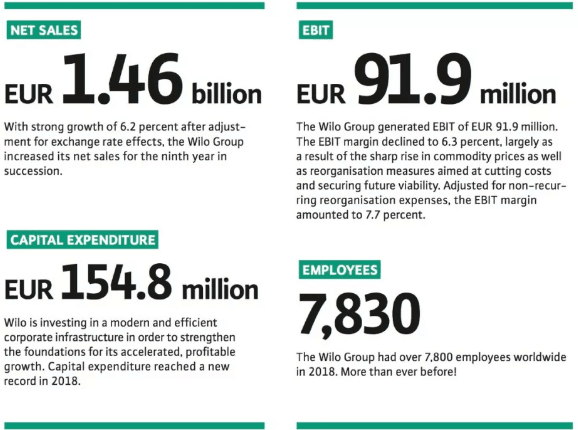 威乐集团再次度过了一个美妙的财政年度。2018年的营业额连续第九次超过上一年的水平,并在货币调整后增长6.2%至14.6亿欧元。“面对所有地缘政治挑战,我们通过持续实施数字化转型,扩大我们的多边合作伙伴关系和网络,以及加强全球化战略,成功地实现既定目标”,WILO SE首席执行官Oliver Hermes表示。特别是在韩国,印度,近东和中东以及东欧 ,尤其是波兰,保持良好增长态势。