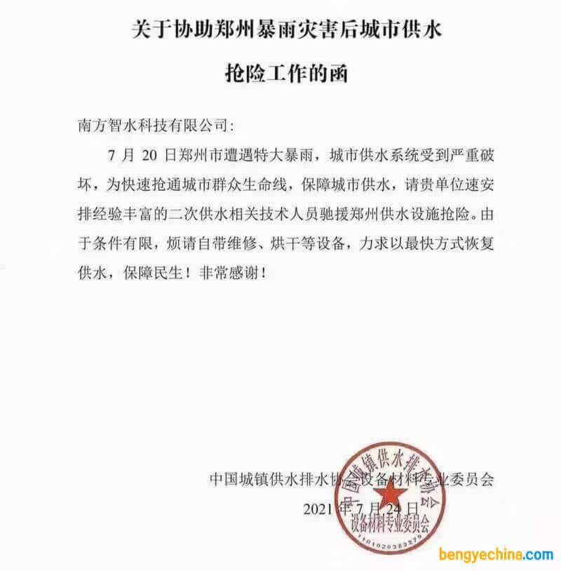 7月20日,郑州遭遇特大暴雨,城市供水系统受到严重破坏。 7月24日,一封协助郑州城市供水抢险的求援函件传到南方泵业。