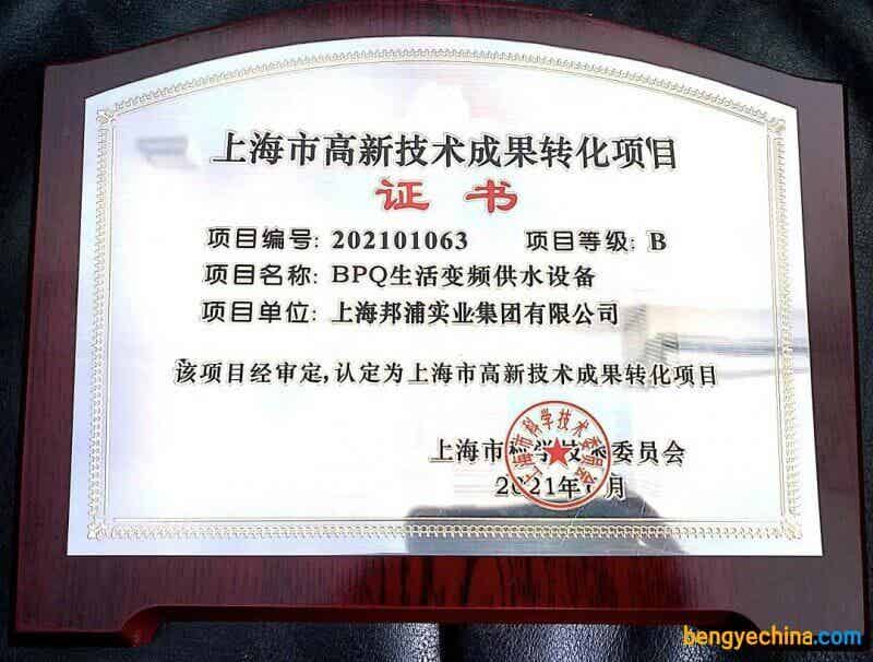 上海邦浦实业(集团)有限公司近年研发的“BPQ生活变频供水设备”荣评“上海市高新技术成果转化项目”。